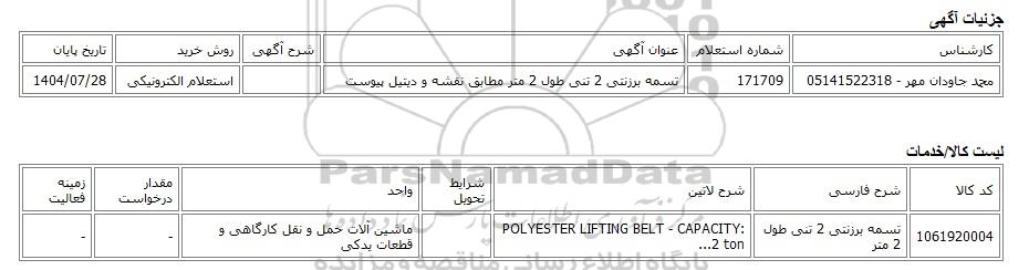 محمد جاودان مهر - 05141522318 | 171709 | تسمه برزنتی 2 تنی طول 2 متر مطابق نقشه و دیتیل پیوست | استعلام الکترونیکی | 1404/07/28 |