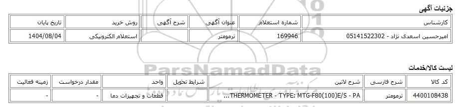 | امیرحسین اسعدی نژاد - 05141522302 | 169946 | ترمومتر | استعلام الکترونیکی | 1404/08/04 |