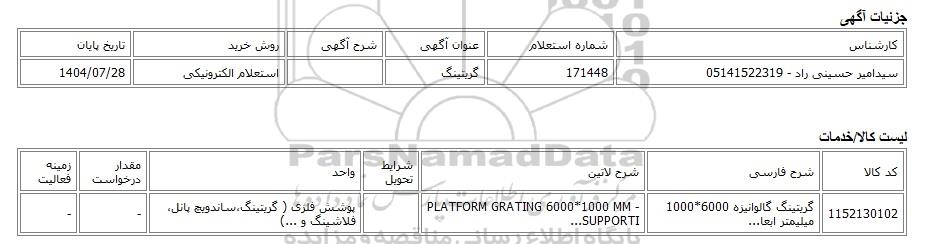 1152130102گریتینگ گالوانیزه 6000*1000 میلیمتر ابعا...PLATFORM GRATING 6000*1000 MM - SUPPORTI... پوشش فلزی ( گریتینگ،ساندویچ پانل، فلاشینگ و ...)--