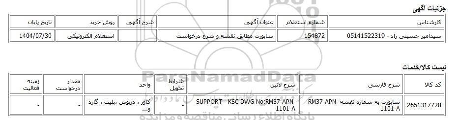 | سیدامیر حسینی راد - 05141522319 | 154872 | ساپورت مطابق نقشه و شرح درخواست | استعلام الکترونیکی | 1404/07/30 |