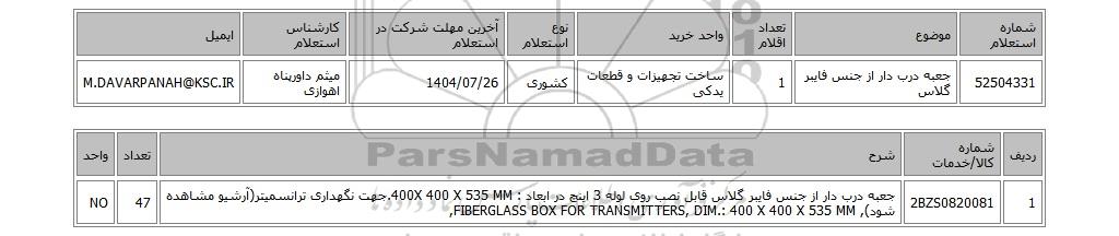 52504331 | جعبه درب دار از جنس فایبر گلاس | 1 | ساخت تجهیزات و قطعات یدکی | کشوری | 1404/07/26 | میثم داورپناه اهوازی | M.DAVARPANAH@KSC.IR |