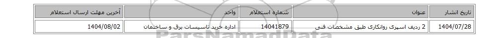 | 1404/07/28 | 2 ردیف اسپری روانکاری طبق مشخصات فنی | 14041879 | اداره خرید تاسیسات برق و ساختمان | 1404/08/02 |