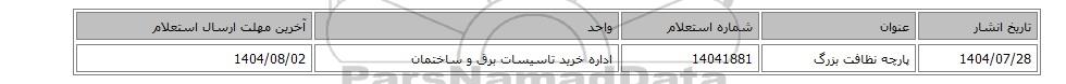 1404/07/28پارچه ‎نظافت‏ ‎بزرگ‏14041881اداره خرید تاسیسات برق و ساختمان1404/08/02