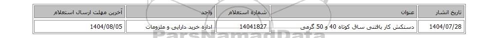 | 1404/07/28 | دستکش کار بافتنی ساق کوتاه 40 و 50 گرمی | 14041827 | اداره خرید دارایی و ملزومات | 1404/08/05 |