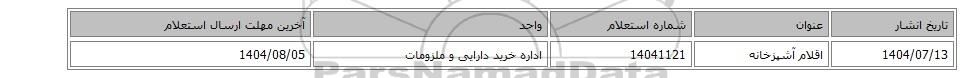 | 1404/07/13 | اقلام آشپزخانه | 14041121 | اداره خرید دارایی و ملزومات | 1404/08/05 |