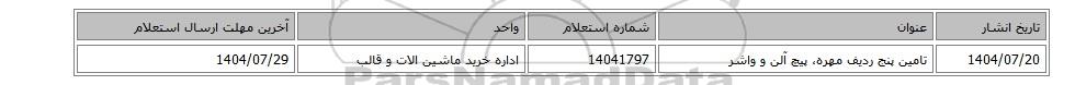 | 1404/07/20 | تامین پنج ردیف مهره، پیچ آلن و واشر | 14041797 | اداره خرید ماشین الات و قالب | 1404/07/29 |