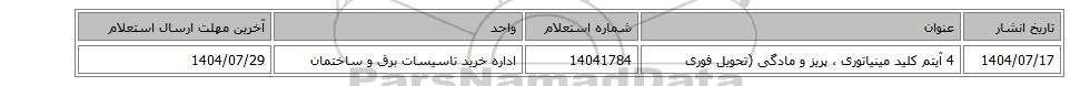 1404/07/17 | 4 آیتم کلید مینیاتوری ، پریز و مادگی (تحویل فوری | 14041784 | اداره خرید تاسیسات برق و ساختمان | 1404/07/29 |