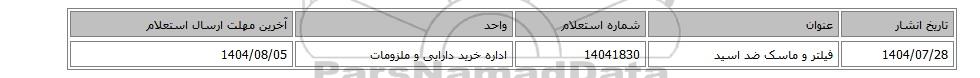 | 1404/07/28 | فیلتر و ماسک ضد اسید | 14041830 | اداره خرید دارایی و ملزومات | 1404/08/05 |