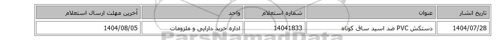 | 1404/07/28 | دستکش PVC ضد اسید ساق کوتاه | 14041833 | اداره خرید دارایی و ملزومات | 1404/08/05 |