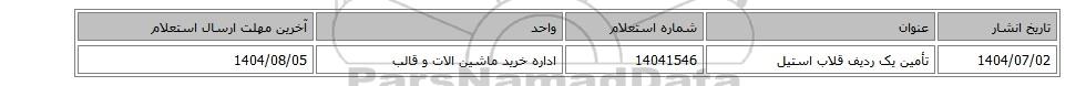 1404/07/02تأمین یک ردیف قلاب استیل14041546اداره خرید ماشین الات و قالب1404/08/05