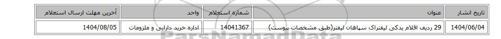 | 1404/06/04 | 29 ردیف اقلام یدکی لیفتراک سپاهان لیفتر(طبق مشخصات پیوست) | 14041367 | اداره خرید دارایی و ملزومات | 1404/08/05 |