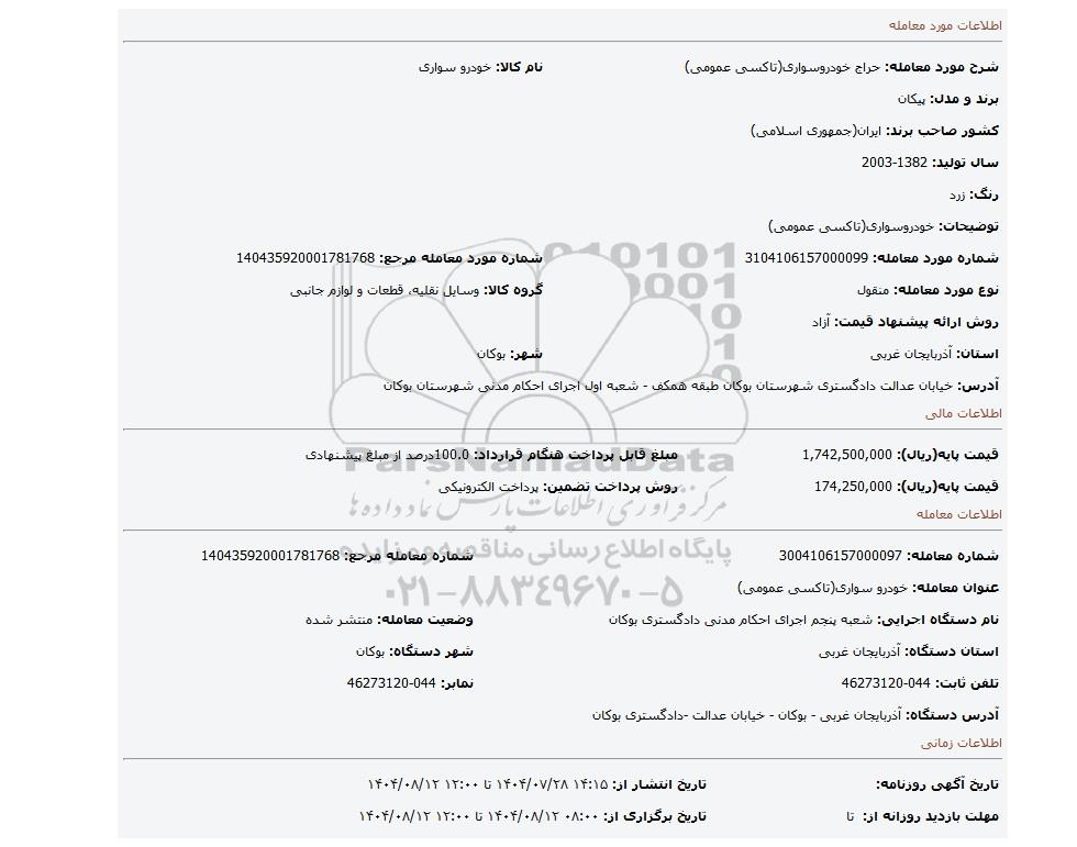 | شرح مورد معامله: حراج خودروسواری(تاکسی عمومی) | نام کالا: خودرو سواری | |