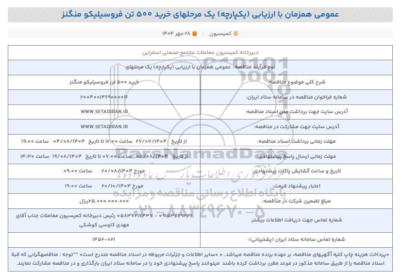 عمومی همزمان با ارزیابی (یکپارچه) یک مرحله ای خرید 500 تن فروسیلیکو منگنز