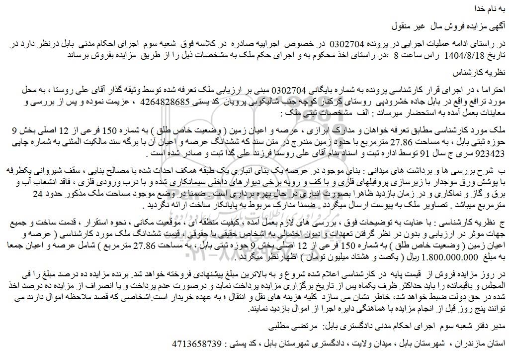 در راستای ادامه عملیات اجرایی در پرونده 0302704 در خصوص اجراییه صادره در کلاسه فوق شعبه سوم اجرای احکام مدنی بابل درنظر دارد در تاریخ 1404/8/18 راس ساعت 8 ،در راستای اخذ محکوم به و اجرای حکم ملک به مشخصات ذیل را از طریق مزایده بفروش برساند