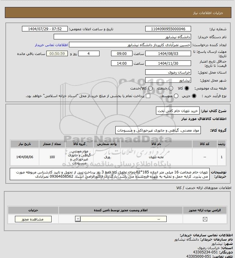 | 1 | -- | تخته نئوپان | ورق | مواد معدنی، گیاهی و جانوری غیرخوراکی و منسوجات | 100 | 1404/08/06 |