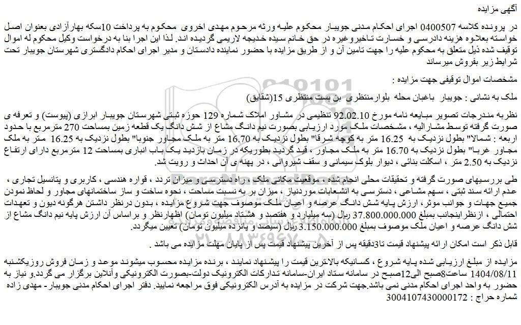 مزایده ملک بصورت نیم دانگ مشاع از شش دانگ یک قطعه زمین بمساحت 270 مترمربع, مزایده ملک بصورت نیم دانگ مشاع از شش دانگ یک قطعه زمین بمساحت 270 مترمربع