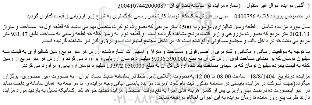 آگهی مزایده اموال غیر منقول (شماره مزایده در سامانه ستاد ایران 3004107442000087 )