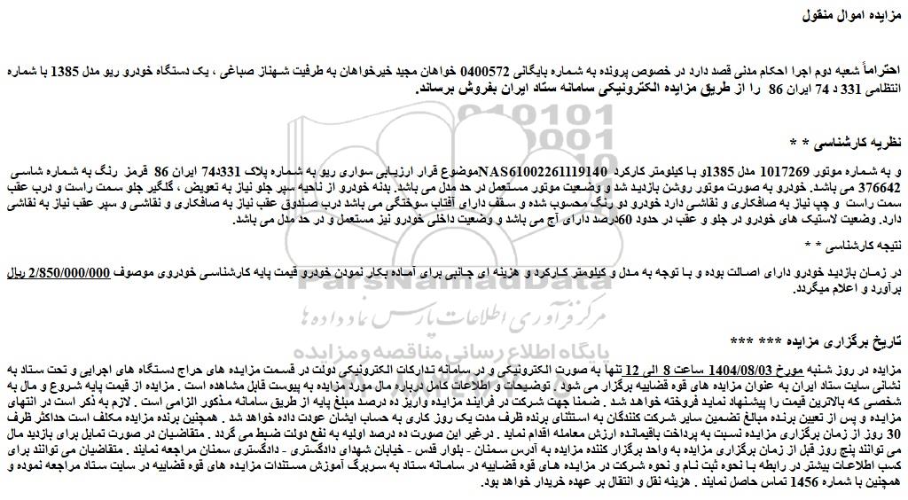 احتراماً شعبه دوم اجرا احکام مدنی قصد دارد در خصوص پرونده به شماره بایگانی 0400572 خواهان مجید خیرخواهان به طرفیت شهناز صباغی ، یک دستگاه خودرو ریو مدل 1385 با شماره انتظامی 331 د 74 ایران 86 را از طریق مزایده الکترونیکی سامانه ستاد ایران بفروش برساند.