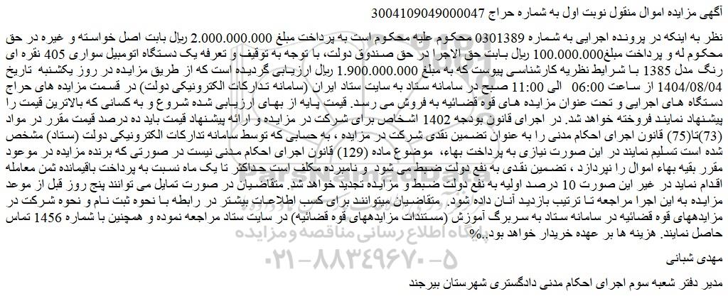 نظر به اینکه در پرونده اجرایی به شماره 0301389 محکوم علیه محکوم است به پرداخت مبلغ 2.000.000.000 ریال بابت اصل خواسته و غیره در حق محکوم له و پرداخت مبلغ100.000.000 ریال بابت حق الاجرا در حق صندوق دولت، با توجه به توقیف و تعرفه یک دستگاه اتومبیل سواری 405 نقره ای رنگ مدل 1385 با شرایط نظریه کارشناسی پیوست که به مبلغ 1.900.000.000 ریال ارزیابی گردیده است که از طریق مزایده در روز یکشنبه تاریخ 1404/08/04 از ساعت 06:00 الی 11:00 صبح در سامانه ستاد به سایت ستاد ایران (سامانه تدارکات الکترونیکی دولت) در قسمت مزایده های حراج دستگاه های اجرایی و تحت عنوان مزایده های قوه قضائیه به فروش می رسد. قیمت پایه از بهای ارزیابی شده شروع و به کسانی که بالاترین قیمت را پیشنهاد نمایند فروخته خواهد شد. در اجرای قانون بودجه 1402 اشخاص برای شرکت در مزایده و ارائه پیشنهاد قیمت باید ده درصد قیمت مقرر در مواد (73)تا(75) قانون اجرای احکام مدنی را به عنوان تضمین نقدی شرکت در مزایده ، به حسابی که توسط سامانه تدارکات الکترونیکی دولت (ستاد) مشخص شده است تسلیم نمایند در این صورت نیازی به پرداخت بهاء، موضوع ماده (129) قانون اجرای احکام مدنی نیست در صورتی که برنده مزایده در موعود مقرر بقیه بهاء اموال را نپردازد ، تضمین نقدی به نفع دولت ضبط می شود و نامبرده مکلف است حداکثر تا یک ماه نسبت به پرداخت باقیمانده ثمن معامله اقدام نماید در غیر این صورت 10 درصد اولیه به نفع دولت ضبط و مزایده تجدید خواهد شد. متقاضیان در صورت تمایل می توانند پنج روز قبل از موعد مزایده به این اجرا مراجعه تا ترتیب بازدید آنان داده شود. متقاضیان میتوانند برای کسب اطلاعات بیشتر در رابطه با نحوه ثبت نام و نحوه شرکت در مزایدههای قوه قضائیه در سامانه ستاد به سربرگ آموزش (مستندات مزایدههای قوه قضائیه) در سایت ستاد مراجعه نموده و همچنین با شماره 1456 تماس حاصل نمایند. هزینه ها بر عهده خریدار خواهد بود..%