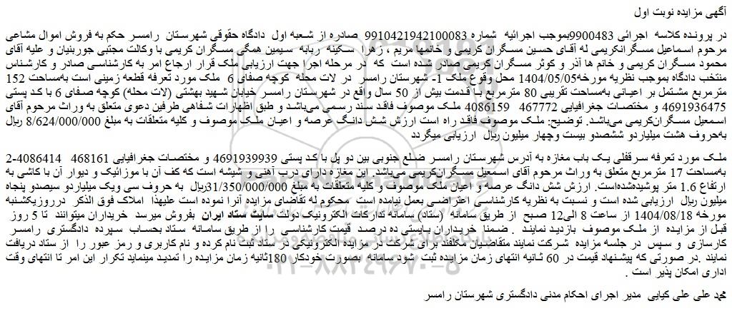 در پرونده کلاسه اجرائی 9900483بموجب اجرائیه شماره 9910421942100083 صادره از شعبه اول دادگاه حقوقی شهرستان رامسر حکم به فروش اموال مشاعی مرحوم اسماعیل مسگرانکریمی له آقای حسین مسگران کریمی و خانمها مریم ، زهرا سکینه ربابه سیمین همگی مسگران کریمی با وکالت مجتبی جوربنیان و علیه آقای محمود مسگران کریمی و خانم ها آذر و کوثر مسگران کریمی صادر شده است که در مرحله اجرا جهت ارزیابی ملک قرار ارجاع امر به کارشناسی صادر و کارشناس منتخب دادگاه بموجب نظریه مورخه1404/05/05 محل وقوع ملک 1- شهرستان رامسر در لات محله کوچه صفای 6 ملک مورد تعرفه قطعه زمینی است به مساحت 152 مترمربع مشتمل بر اعیانی به مساحت تقریبی 80 مترمربع با قدمت بیش از 50 سال واقع در شهرستان رامسر خیابان شهید بهشتی (لات محله) کوچه صفای 6 با کد پستی 4691936475 و مختصات جغرافیایی 467772 4086159 ملک موصوف فاقد سند رسمی می باشد و طبق اظهارات شفاهی طرفین دعوی متعلق به وراث مرحوم آقای اسمعیل مسگران کریمی می باشد. توضیح: ملک موصوف فاقد راه است ارزش شش دانگ عرصه و اعیان ملک موصوف و کلیه متعلقات به مبلغ 8/624/000/000 ریال به حروف هشت میلیاردو ششصدو بیست وچهار میلیون ریال ارزیابی میگردد