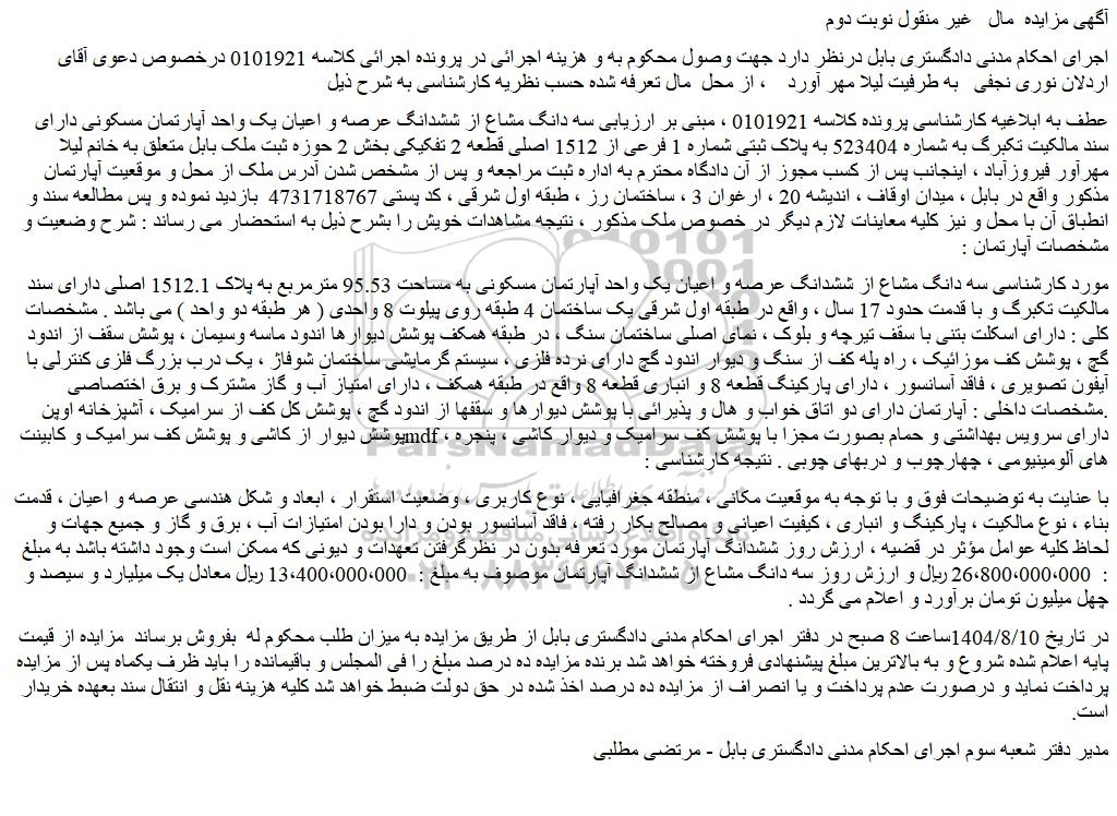 در تاریخ 1404/8/10ساعت 8 صبح در دفتر اجرای احکام مدنی دادگستری بابل از طریق مزایده به میزان طلب محکوم له  بفروش برساند  مزایده از قیمت پایه اعلام شده شروع و به بالاترین مبلغ پیشنهادی فروخته خواهد شد برنده مزایده ده درصد مبلغ را فی المجلس و باقیمانده را باید ظرف یکماه پس از مزایده پرداخت نماید و درصورت عدم پرداخت و یا انصراف از مزایده ده درصد اخذ شده در حق دولت ضبط خواهد شد کلیه هزینه نقل و انتقال سند بعهده خریدار است.