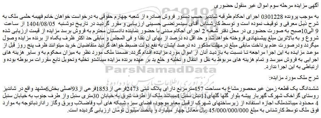 آگهی مزایده مرحله سوم اموال غیر منقول حضوری