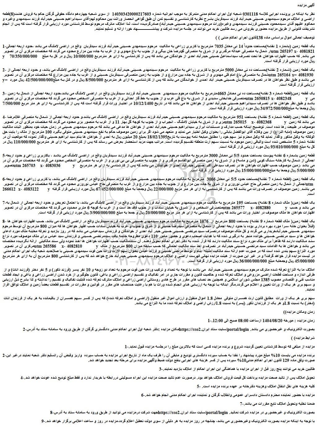 نظر به اینکه در پرونده اجرایی کلاسه 0301118 شعبه اول اجرای احکام مدنی متمرکز به موجب اجرائیه شماره 140303420000217603 از سوی شعبه چهاردهم دادگاه حقوقی گرگان حکم به فروش هشت(8)قطعه اراضی و املاک مرحوم سیدمهدی حسینی حیدرآباد فرزند سیدقربان بشرح نظریه کارشناسی و تقسیم ثمن آن طبق گواهی انحصار وراثت بین محکوم لهم:آقای سیدابراهیم حسینی حیدرآباد فرزند سیدمهدی وغیره و محکوم علیهم آقای سیدمحمود حسینی فرزند سیدمهدی وغیره(وراث مرحوم سیدمهدی حسینی حیدرآباد) صادرگردیده است، لذا املاک ماترک مرحوم توسط کارشناس مورد ارزیابی قرار گرفته است که پس از انجام تشریفات قانونی از طریق مزایده حضوری بفروش می رسد طالبین خرید می توانند در جلسه مزایده شرکت و پیشنــــــــــــــــهاد خورا ارائه و تسلیم نمایند.