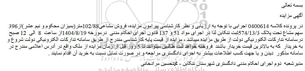 در پرونده کلاسه 0400614 اجرایی با توجه به ارزیابی و نظر کارشناسی پیرامون مزایده، فروش مشاعی102/88متر(بمیزان محکوم و نیم عشر)از396 سهم مشاع تحت پلاک 574/13/3ثبت تنکابن لذا در اجرای مواد 51 و 137 قانون اجرای احکام مدنی درمورخه 1404/8/19از ساعت 8 الی 12 صبح درسامانه تدارکات الکتورنیکی دولت از طریق مزایده میباشد ، مزایده از قیمت پایه کارشناسی مندرج از طریق سامانه تدارکات الکترونیکی دولت شروع و به خریدار که به بالاترین قیمت خریدار باشند فروخته خواهد شد، طالبین میتوانند تا 5 روز قبل از زمان مزایده از ملک واقع در آدرس اعلامی مندرج در سامانه مذکور دیدن و یا جهت کسب اطلاعات بیشتر به اجرای دادگستری مراجعه و در صورت تمایل نسبت به خرید آن اقدام نمایند .