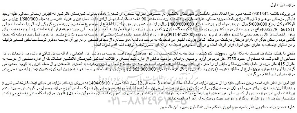 این اجرا در نظر دارد قطعه زمین محکوم علیه را از طریق مزایده در سامانه ستاد از ساعت 8 صبح الی 12 روز شنبه مورخ 1404/08/10 به فروش برساند. مزایده بر مبنای قیمت کارشناسی شروع و به بالاترین قیمت پیشنهادی فروخته و 10 درصد بهای مزایده یک روز قبل از مزایده از طریق سامانه ستاد اخذ خواهد شد و مابقی ظرف یک ماه از تاریخ مزایده وصول می گردد. در صورت عدم پرداخت مابقی ثمن مزایده، پس از کسر سایر هزینه های اجرا به نفع دولت ضبط خواهد شد. شرکت در مزایده برای عموم به استثنای مشمولین ماده 127 قانون اجرای احکام مدنی بلامانع می باشد. متقاضیان ظرف 5 روز قبل از برگزاری مزایده جهت رویت به این اجرا مراجعه نمایند