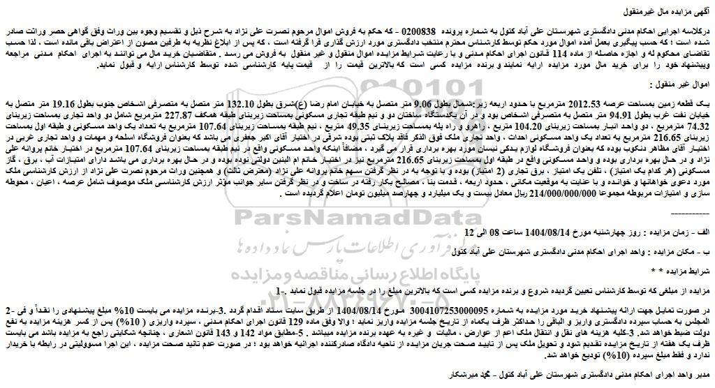 درکلاسه اجرایی احکام مدنی دادگستری شهرستان علی آباد کتول به شماره پرونده 0200838 - که حکم به فروش اموال مرحوم نصرت علی نژاد به شرح ذیل و تقسیم وجوه بین وراث وفق گواهی حصر وراثت صادر شده است ؛ که حسب پیگیری بعمل آمده اموال مورد حکم توسط کارشناس محترم منتخب دادگستری مورد ارزش گذاری قرا گرفته است ، که پس از ابلاغ نظریه به طرفین مصون از اعتراض باقی مانده است ، لذا حسب تقاضای محکوم له و اجازه حاصله از ماده 114 قانون اجرای احکام مدنی و با رعایت شرایط مزایده اموال منقول و غیر منقول به فروش می رسد . متقاضیان خرید مال می توانند به اجرای احکام مدنی مراجعه وپیشنهاد خود را برای خرید مال مورد مزایده ارایه نمایند و برنده مزایده کسی است که بالاترین قیمت را از قیمت پایه کارشناسی شده توسط کارشناس ارایه و قبول نماید.