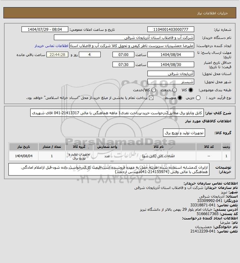 شرح کلی نیاز: کابل وتابلو برق مطابق2درخواست خرید-پرداخت نقدی1 ماهه هماهنگی با مالی 21413317-041 اقای شهیدی