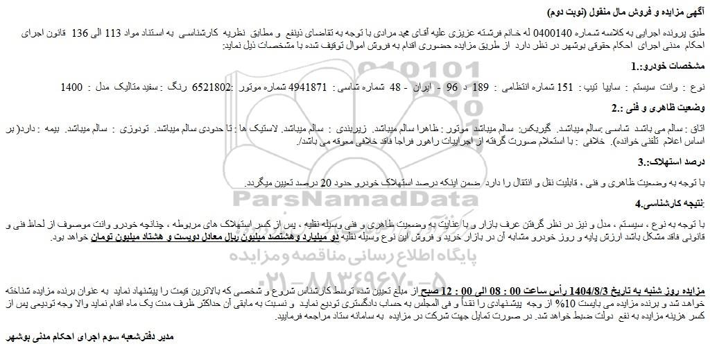 آگهی مزایده و فروش مال منقول (نوبت دوم)