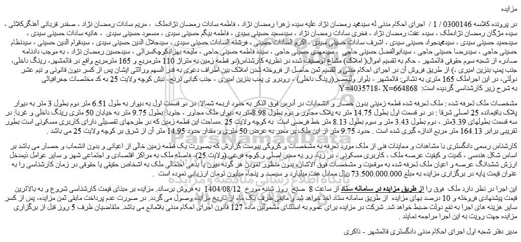 در پرونده کلاسه 0300146 / 1 / اجرای احکام مدنی له سیدمحمد رمضان نژاد علیه سیده زهرا رمضان نژاد ، فاطمه سادات رمضان نژادملک ، مریم سادات رمضان نژاد ، صفدر قربانی آهنگرکلائی ، سیده مژگان رمضان نژادملک ، سیده عفت رمضان نژاد ، فخری سادات رمضان نژاد ، سیدسعید حسینی سیدی ، فاطمه بیگم حسینی سیدی ، مسعود حسینی سیدی ، هانیه سادات حسینی سیدی ، سیدحمید حسینی سیدی ، سیدمحمدجواد حسینی سیدی ، اشرف سادات حسینی سیدی ، اکرم السادات حسینی ، فرشته السادات حسینی سیدی ، سیدجلال الدین حسینی سیدی ، سیدقوام الدین حسینی ، سیدنظام حسینی حاجی ، سیدرضا حسینی حاجی ، سیدابوالفضل حسینی حاجی ، سیدمهدی حسینی حاجی ، سیده فاطمه حسینی حاجی ، ملیحه بهزادکوچکسرائی ، سیدحسین رمضان نژاد ، به موجب دادنامه صادره از شعبه سوم حقوقی قائمشهر ، حکم به تقسیم اموال( املاک) مشاع توصیف شده در نظریه کارشناس(دو قطعه زمین به متراژ 110 مترمربع و 165 مترمربع واقع در قائمشهر، رینگ داخلی، جنب پمپ بنزین امیری ،) از طریق فروش آن در اجرای احکام مدنی و تقسیم ثمن حاصل از فروخته شدن املاک بین اطراف دعوی به قدر السهم وراثتی ایشان پس از کسر دیون قانونی و نیم عشر دولتی، در این اجراملک 165 متری به نشانی: قائمشهر - بلوار ولیعصر(رینگ داخلی) - روبرو ی پمب بنزین امیری - جنب کبابی ترنج- نبش کوچه ولایت 25 به کد مختصات جغرافیائی y=4035718، x=664868 به شرح زیر کارشناسی گردیده است: