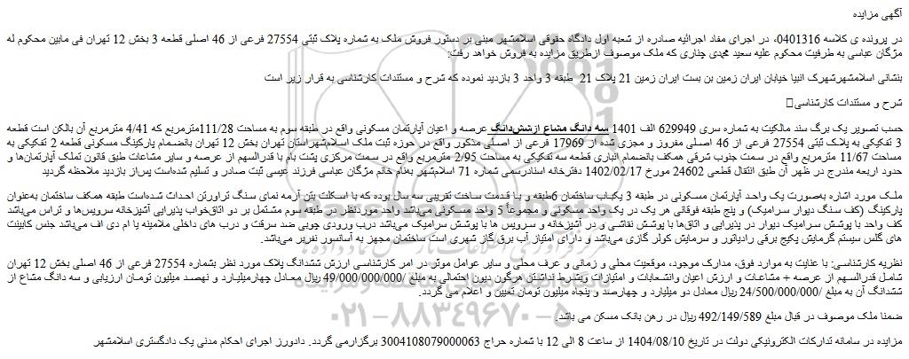 در پرونده ی کلاسه 0401316، در اجرای مفاد اجرائیه صادره از شعبه اول دادگاه حقوقی اسلامشهر مبنی بر دستور فروش ملک به شماره پلاک ثبتی 27554 فرعی از 46 اصلی قطعه 3 بخش 12 تهران فی مابین محکوم له مژگان عباسی به طرفیت محکوم علیه سعید محمدی چناری که ملک موصوف ازطریق مزایده به فروش خواهد رفت: