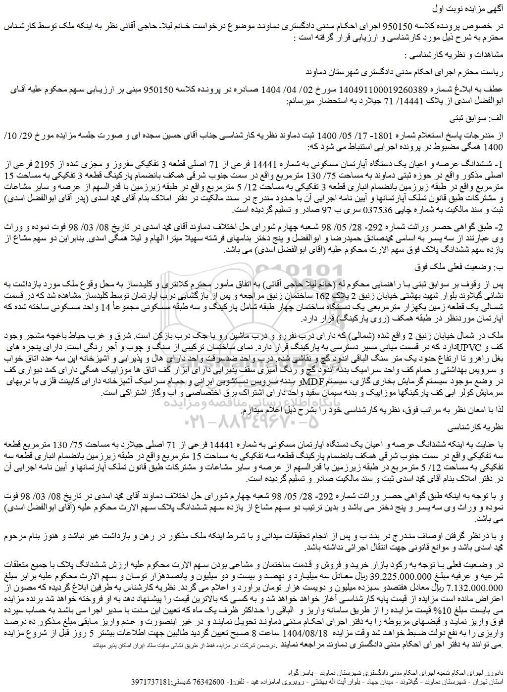 عطف به ابلاغ شماره 140491100019260389 مورخ 02/ 04/ 1404 صادره در پرونده کلاسه 950150 مبنی بر ارزیابی سهم محکوم علیه آقای ابوالفضل اسدی از پلاک 14441/ 71 جیلارد به استحضار میرسانم: