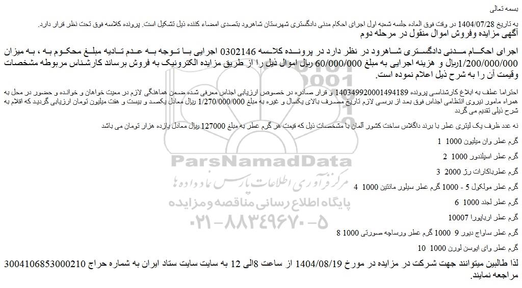 اجرای احکام مدنی دادگستری شاهرود در نظر دارد در پرونده کلاسه 0302146 اجرایی با توجه به عدم تادیه مبلغ محکوم به ، به میزان 1/200/000/000ریال و هزینه اجرایی به مبلغ 60/000/000 ریال اموال ذیل را از طریق مزایده الکترونیک به فروش برساند کارشناس مربوطه مشخصات وقیمت آن را به شرح ذیل اعلام نموده است.