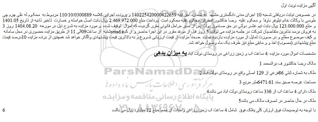 مشخصات اموال مورد مزایده :4 ساعت اب و زمین زراعی در روستای دولت اباد به میزان بدهی