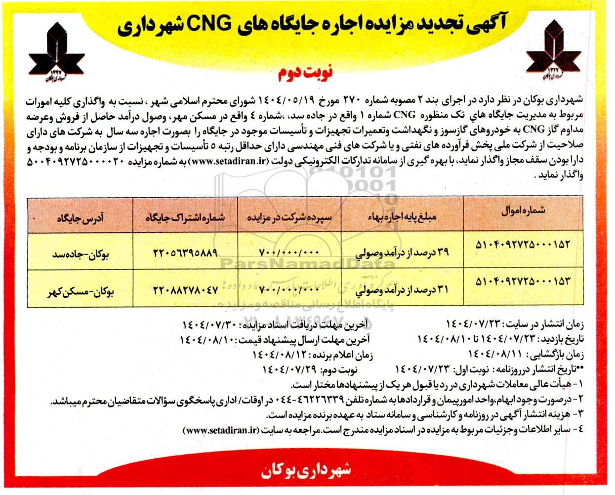 شهرداری بوکان در نظر دارد در اجرای بند 2 مصوبه شماره 270 مورخ 1404.5.19 شورای محترم اسلامی شهر نسبت به واگذاری کلیه امورات مربوط به مدیریت جایگاه های تک منظوره CNG شماره 1 واقع در جاده سد، شماره 4 واقع در مسکن مهر، وصول درآمد حاصل از فروش و عرضه مداوم گاز CNG به خودروهای گازسوز و نگهداشت و تعمیرات تجهیزات و تأسیسات موجود در جایگاه را بصورت اجاره سه سال به شرکت های دارای صلاحیت از شرکت ملی پخش فرآورده های نفتی و یا شرکتهای فنی مهندسی دارای حداقل رتبه 5 تأسیسات و تجهیزات از سازمان برنامه و بودجه و دارا بودن سقف مجاز واگذار نماید با بهره گیری از سامانه تدارکات الکترونیکی دولت ستاد ایران به شماره مزایده 5004092725000020 واگذار نماید .