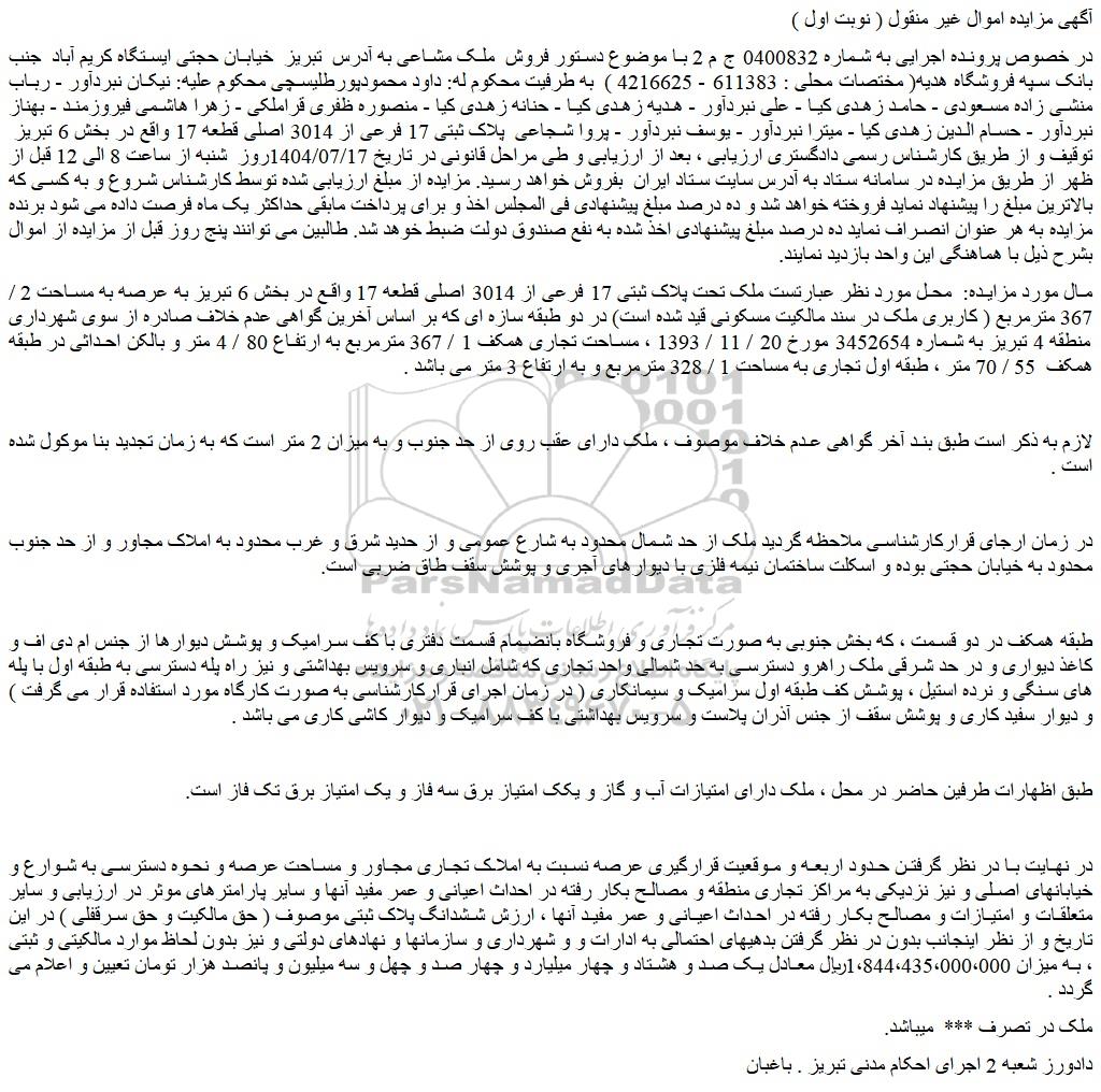 در خصوص پرونده اجرایی به شماره 0400832 ج م 2 با موضوع دستور فروش ملک مشاعی به آدرس تبریز خیابان حجتی ایستگاه کریم آباد جنب بانک سپه فروشگاه هدیه( مختصات محلی : 611383 - 4216625 ) به طرفیت محکوم له: داود محمودپورطلیسچی محکوم علیه: نیکان نبردآور - رباب منشی زاده مسعودی - حامد زهدی کیا - علی نبردآور - هدیه زهدی کیا - حنانه زهدی کیا - منصوره ظفری قراملکی - زهرا هاشمی فیروزمند - بهناز نبردآور - حسام الدین زهدی کیا - میترا نبردآور - یوسف نبردآور - پروا شجاعی پلاک ثبتی 17 فرعی از 3014 اصلی قطعه 17 واقع در بخش 6 تبریز توقیف و از طریق کارشناس رسمی دادگستری ارزیابی ، بعد از ارزیابی و طی مراحل قانونی در تاریخ 1404/07/17روز شنبه از ساعت 8 الی 12 قبل از ظهر از طریق مزایده در سامانه ستاد به آدرس سایت ستاد ایران بفروش خواهد رسید. مزایده از مبلغ ارزیابی شده توسط کارشناس شروع و به کسی که بالاترین مبلغ را پیشنهاد نماید فروخته خواهد شد و ده درصد مبلغ پیشنهادی فی المجلس اخذ و برای پرداخت مابقی حداکثر یک ماه فرصت داده می شود برنده مزایده به هر عنوان انصراف نماید ده درصد مبلغ پیشنهادی اخذ شده به نفع صندوق دولت ضبط خوهد شد. طالبین می توانند پنج روز قبل از مزایده از اموال بشرح ذیل با هماهنگی این واحد بازدید نمایند.