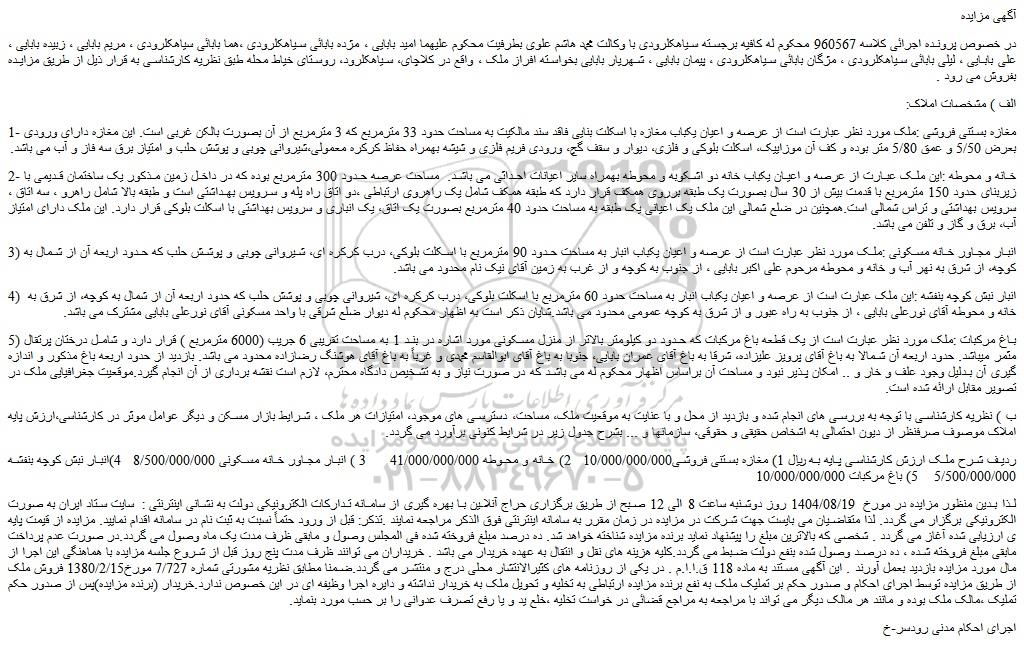 در خصوص پرونده اجرائی کلاسه 960567 محکوم له کافیه برجسته سیاهکلرودی با وکالت محمد هاشم علوی بطرفیت محکوم علیهما امید بابایی ، مژده بابائی سیاهکلرودی ،هما بابائی سیاهکلرودی ، مریم بابایی ، زبیده بابایی ، علی بابایی ، لیلی بابائی سیاهکلرودی ، مژگان بابائی سیاهکلرودی ، پیمان بابایی ، شهریار بابایی بخواسته افراز ملک ، واقع در کلاچای، سیاهکلرود، روستای خیاط محله طبق نظریه کارشناسی به قرار ذیل از طریق مزایده بفروش می رود .