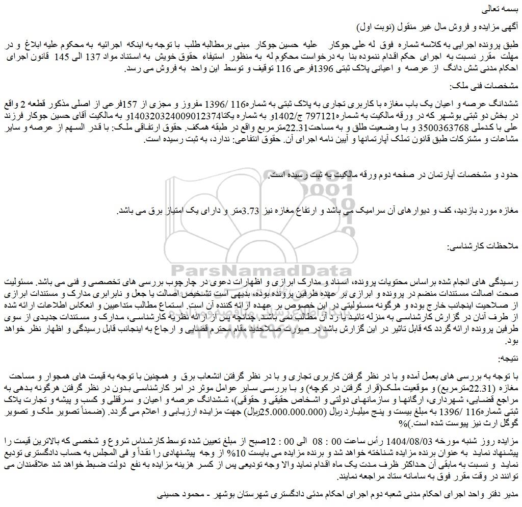 ششدانگ عرصه و اعیان یک باب مغازه با کاربری تجاری به پلاک ثبتی به شماره116 /1396 مفروز و مجزی از 157فرعی از اصلی مذکور قطعه 2 واقع در بخش دو ثبتی بوشهر که در ورقه مالکیت به شماره797121 ج/1402و به شماره یکتا140320324009012374و به مالکیت آقای حسین جوکار فرزند علی با کدملی 3500363768 و با وضعیت طلق و به مساحت22.31مترمربع واقع در طبقه همکف. حقوق ارتفاقی ملک: با قدر السهم از عرصه و سایر مشاعات و مشترکات طبق قانون تملک آپارتمانها و آیین نامه اجرای آن. حقوق انتفاعی: ندارد، به ثبت رسیده است.