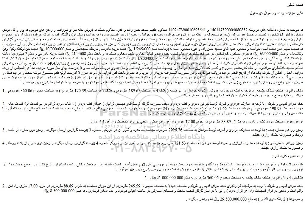به موجب به شماره دادنامه های مربوطه 140147390004080832 و 140247390010695641 محکوم علیهم سعید حسن زاده و غیره محکوم هستند به فروش خانه سرای شوراب، و زمین های موسوم به یور و کل موذی مطابق با نظر کارشناس و تقسیم ما حصل بین طرفین (بدین توضیح که در خانه سرای شوراب خوانده ردیف 6 و خواهان ردیف اول حق السهم خود را به خوانده ردیف اول واگذار نموده اند لذا خوانده ردیف اول در مجموع دارای 5 سهم خواهد بود و خوانده ردیف 7 از خانه سرای شوراب حق السهمی نخواهد داشت) و نیز محکوم هستند به فروش ترکه شامل2 پلاک 4 و 5 از زمین سنگ چشمه برابر مساحت و محدوده کروکی ترسیمی گزارش کارشناسی با رعایت مقررات قانون اجرای احکام مدنی ناظر بر فروش اموال غیرمنقول و تقسیم وجوه حاصل از فروش بین ورثه پس از کسر هزینه اجرایی بین ورثه (به استثنای دو نفر از ورثه به اسامی علی و دلبر حسن زاده) به نسبت سهم آنان بابت اصل خواسته و محکوم علیه آقای سعید حسن زاده و غیره محکوم است به پرداخت مبلغ 1/245/000 ریال بابت هزینه دادرسی مرحله تجدیدنظر و مبلغ 10/000/000 ریال بابت حق الوکاله وکیل وفق وکالت نامه و مبلغ 56/000/000 ریال به عنوان دستمزد کارشناس در حق تجدیدنظرخواه خانم فاطمه حسن زاده و نهایتاً محکوم علیهم محکوم هستند به پرداخت مبلغ 2144608 ریال بابت هزینه دادرسی و مبلغ 7 میلیون ریال بابت هزینه کارشناسی جملگی در حق محکوم لهم  علی حسن زاده و غیره و همچنین محکوم هستند به پرداخت مبلغ 1/800/000 ریال بابت هزینه اجراء در حق دولت و با عنایت به اینکه محکوم علیهم ازانجام عمل فوق الذکر امتنا نموده و حسب تقاضای محکوم لهم اجرای احکام قرار کارشناسی صادر و کارشناس ارزش مال توقیف شده را بشرح ذیل اعلام نموده است لهذا مزایده در روز یکشنبه مورخ 1404/07/11 ساعت 10 صبح در محل اجرای احکام شعبه دادگستری سوادکوه، از مبلغ کارشناسی شروع و کسی که بالاترین مبلغ هر مال را پیشنهاد نماید، برنده مزایده تلقی و مال به وی فروخته خواهد شد و 10درصد بهای مال مورد مزایده نقداً فی المجلس از برنده مزایده اخذ و الباقی آن ظرف یک ماه از تاریخ انجام مزایده دریافت می گردد و در صورت انصراف خریدار از خرید و یا عدم پرداخت ثمن مزایده در موعد مقرر 10درصد اولیه بنفع صندوق دولت ضبط و مزایده باطل و تجدید می گردد و متقاضیان شرکت در مزایده می توانند ظرف پنج روز قبل از موعد مزایده در دایره اجرای احکام شعبه حاضر تا ترتیب بازدید آنان از مال غیرمنقول توقیف شده داده شود. اموال مورد مزایده ارث پدری طرفین دعوی واقع در روستای شوراب به شرح زیر می باشد :ین املاک مطابق مدارک مضبوط در پرونده و اجرائیه صادره از شعبه دوم دادگاه حقوقی سوادکوه و با تعرفه توسط خواهان ها بشرح زیر میباشند :