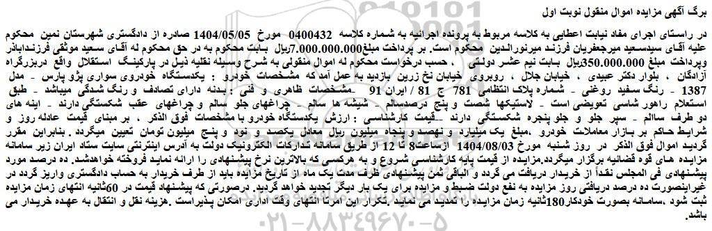 در راستای اجرای مفاد نیابت اعطایی به کلاسه مربوط به پرونده اجرائیه به شماره کلاسه 0400432 مورخ 1404/05/05 صادره از دادگستری شهرستان نمین محکوم علیه آقای سیدسعید میرجعفریان فرزند میرنورالدین محکوم است. بر پرداخت مبلغ7.000.000.000ریال بابت محکوم به در حق محکوم له آقای سعید موثقی فرزنداباذر وپرداخت مبلغ 350.000.000ریال بابت نیم عشر دولتی ، حسب درخواست محکوم له اموال منقولی به شرح وسیله نقلیه ذیل در پارکینگ استقلال واقع دربزرگراه آزادگان ، بلوار دکتر عبیدی ، خیابان جلال ، روبروی خیابان نخ زرین بازدید به عمل آمد که مشخصات خودرو : یکدستگاه خودروی سواری پژو پارس - مدل 1387 - رنگ سفید روغنی - شماره پلاک انتظامی 781 ج 81 / ایران 91 -مشخصات ظاهری و فنی : بدنه دارای تصادف و رنگ شدگی میباشد - طبق استعلام راهور شاسی تعویضی است - لاستیکها شصت و پنج درصدسالم - شیشه ها سالم - چراغهای جلو سالم و چراغهای عقب شکستگی دارند - اینه های دو طرف ساالم - سپر جلو و جلو پنجره شکستگی دارند --قیمت کارشناسی : ارزش یکدستگاه خودرو با مشخصات فوق الذکر ، بر مبنای قیمت عادله روز و شرایط حاکم بر بازار معاملات خودرو ،مبلغ یک میلیارد و نهصد و پنجاه میلیون ریال معادل یکصد و نود و پنج میلیون تومان تعیین میگردد . بنابراین مقرر گردید اموال فوق الذکر در روز شنبه مورخ 1404/08/03 ازساعت8 تا 12 از طریق سامانه تدارکات الکترونیک دولت به آدرس اینترنتی سایت ستاد ایران زیر سامانه مزایده های قوه قضائیه برگزار میگردد.مزایده از قیمت پایه کارشناسی شروع و به هرکسی که بالاترین نرخ پیشنهادی را ارائه نماید فروخته خواهدشد. ده درصد مورد پیشنهادی فی المجلس نقداً از خریدار دریافت می گردد و الباقی ثمن پیشنهادی ظرف مدت یک ماه از تاریخ مزایده باید از طرف خریدار به حساب دادگستری واریز گردد در غیراینصورت ده درصد دریافتی روز مزایده به نفع دولت ضبط و مزایده برای یک بار دیگر تجدید خواهد گردید. درصورتی که پیشنهاد قیمت در 60ثانیه انتهای زمان مزایده ثبت شود ،سامانه بصورت خودکار180ثانیه زمان مزایده را تمدید می نماید .تکرار این امرتا انتهای وقت اداری امکان پذیراست .هزینه نقل و انتقال به عهده خریدار می باشد.