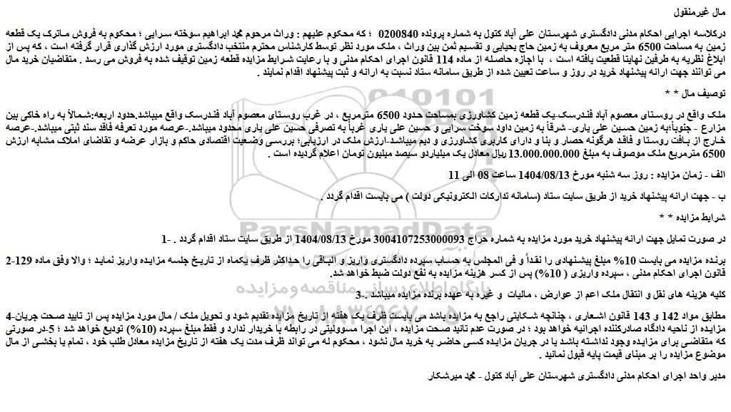 درکلاسه اجرایی احکام مدنی دادگستری شهرستان علی آباد کتول به شماره پرونده 0200840 ؛ که محکوم علیهم : وراث مرحوم محمد ابراهیم سوخته سرایی ؛ محکوم به فروش ماترک یک قطعه زمین به مساحت 6500 متر مربع معروف به زمین حاج یحیایی و تقسیم ثمن بین وراث ، ملک مورد نظر توسط کارشناس محترم منتخب دادگستری مورد ارزش گذاری قرار گرفته است ، که پس از ابلاغ نظریه به طرفین نهایتا قطعیت یافته است ، با اجازه حاصله از ماده 114 قانون اجرای احکام مدنی و با رعایت شرایط مزایده قطعه زمین توقیف شده به فروش می رسد . متقاضیان خرید مال می توانند جهت ارائه پیشنهاد خرید در روز و ساعت تعیین شده از طریق سامانه ستاد نسبت به ارائه و ثبت پیشنهاد اقدام نمایند .