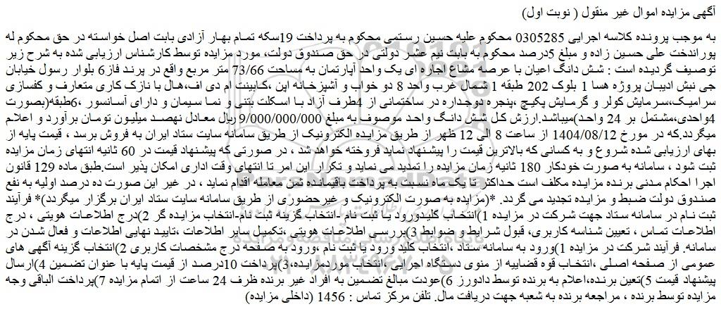 به موجب پرونده کلاسه اجرایی 0305285 محکوم علیه حسین رستمی محکوم به پرداخت 19سکه تمام بهار آزادی بابت اصل خواسته در حق محکوم له پوراندخت علی حسین زاده و مبلغ 5درصد محکوم به بابت نیم عشر دولتی در حق صندوق دولت، مورد مزایده توسط کارشناس ارزیابی شده به شرح زیر توصیف گردیده است : شش دانگ اعیان با عرصه مشاع اجاره ای یک واحد آپارتمان به مساحت 73/66 متر مربع واقع در پرند فاز6 بلوار رسول خیابان جی نبش ادیبان پروژه هسا 1 بلوک 202 طبقه 1 شمال غرب واحد 8 دو خواب و آشپزخانه اپن ،کابینت ام دی اف،هال با نازک کاری متعارف و کفسازی سرامیک،سرمایش کولر و گرمایش پکیچ ،پنجره دوجداره در ساختمانی از 4طرف آزاد با اسکلت بتنی و نما سیمان و دارای آسانسور ،6طبقه(بصورت 4واحدی،مشتمل بر 24 واحد)میباشد.ارزش کل شش دانگ واحد موصوف به مبلغ 9/000/000/000 ریال معادل نهصد میلیون تومان برآورد و اعلام میگردد.که در مورخ 1404/08/12 از ساعت 8 الی 12 ظهر از طریق مزایده الکترونیک از طریق سامانه سایت ستاد ایران به فروش برسد ، قیمت پایه از بهای ارزیابی شده شروع و به کسانی که بالاترین قیمت را پیشنهاد نماید فروخته خواهد شد ، در صورتی که پیشنهاد قیمت در 60 ثانیه انتهای زمان مزایده ثبت شود ، سامانه به صورت خودکار 180 ثانیه زمان مزایده را تمدید می نماید و تکرار این امر تا انتهای وقت اداری امکان پذیر است.طبق ماده 129 قانون اجرا احکام مدنی برنده مزایده مکلف است حداکثر تا یک ماه نسبت به پرداخت باقیمانده ثمن معامله اقدام نماید ، در غیر این صورت ده درصد اولیه به نفع صندوق دولت ضبط و مزایده تجدید می گردد. *(مزایده به صورت الکترونیک و غیرحضوری از طریق سامانه سایت ستاد ایران برگزار میگردد)* فرآیند ثبت نام در سامانه ستاد جهت شرکت در مزایده 1)انتخاب کلیدورود یا ثبت نام -انتخاب گزینه ثبت نام-انتخاب مزایده گر 2)درج اطلاعات هویتی ، درج اطلاعات تماس ، تعیین شناسه کاربری، قبول شرایط و ضوابط 3)بررسی اطلاعات هویتی ،تکمیل سایر اطلاعات ،تایید نهایی اطلاعات و فعال شدن در سامانه. فرآیند شرکت در مزایده 1)ورود به سامانه ستاد ،انتخاب کلید ورود یا ثبت نام ،ورود به صفحه درج مشخصات کاربری 2)انتخاب گزینه آگهی های عمومی از صفحه اصلی ،انتخاب قوه قضاییه از منوی دستگاه اجرایی ،انتخاب موردمزایده،3)پرداخت 10درصد از قیمت پایه با عنوان تضمین 4)ارسال پیشنهاد قیمت 5)تعین برنده،اعلام به برنده توسط دادورز 6)عودت مبالغ تضمین به افراد غیر برنده ظرف 24 ساعت از اتمام مزایده 7)پرداخت الباقی وجه مزایده توسط برنده ، مراجعه برنده به شعبه جهت دریافت مال. تلفن مرکز تماس : 1456 (داخلی مزایده)