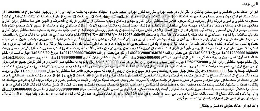 اجرای احکام مدنی دادگستری شهرستان چادگان در نظر دارد در جهت اجرای مقررات قانون اجرای احکام مدنی و استیفاء محکوم به جلسه مزایده ای را در روزچهار شنبه مورخ 1404/08/14 از ساعت 8صبح لغایت 12 صبح از طریق سامانه تدارکات الکترونیکی دولت (سایت ستاد ایران) جهت وصول محکوم به مهریه به تعداد 200 عدد سکه تمام بهار آزادی در حق محکوم له خانم پری امیری فرزند زاغی بطرفیت ورثه مرحوم غلامرضا سلطانی ازان آخاری مهدی وماهان ومهدیه سلطانی ازان آخاری فرزندان غلامرضا و آقایان علیرضا سلطانی ازان آخاری وخانمها فرزانه و پروانه ورضوان وافسانه و مهدیه همگی سلطانی ازان آخاری فرزندان احمد نسبت به ماترک و سهم الارث از منزل مسکونی پدر و مادرش از سهم الارث مرحوم غلامرضا سلطانی موضوع فروش قسمتی از پلاک ثبتی 144فرعی از 127 اصلی واقع در بخش سیزده ثبت اصفهان به نشانی روستای حجت آباد خ اصلی جنب مخابرات به مالکیت احمد سلطانی ازان آخاری وخانم فاطمه میرزایی هر کدام سه دانگ مشاع به مختصات utm x= 481276 y= 3619953، یک باب ساختمان با کاربری مسکونی در یک طبقه با قدمت بالای 30 سال با مساحت 660/55 متر مربع ،عرصه دارای سازه دیوار باربر با سقف تیر آهن و تیرچه بلوک در قسمتی و تیر چوبی در قسمت دیگر، پوشش بدنه دیوارها گچ و خاک و اندود گچ، سرویس بهداشتی بدون نما در حیاط، حمام پوشش سرامیک در کف و بدنه داخل بنا، دارای یک انباری با دیوار بلوکی و سقف چوبی، فریم پنجره ها و در ها آهنی شیشه خور، گرمایش بخاری گازی و دارای امتیازات آب، برق و گاز است.ملک مورد نظر در حال حاضر مشاع بوده و غیر قابل افراز است- ساختمان درون ملک مستعمل بوده و در حال حاضر فاقد متصرف(مستاجر) است.حصه وراث مطابق گواهی حصر وراثت 140212390001044089 مورخ1402/02/16، گواهی حصر وراثت 140212390001040702 و گواهی حصر وراثت 140212390002706489 مورخ 1402/03/29 عبارت است از: خانم ها افسانه، فرزانه، رضوان و پروانه همگی سلطانی ازان آخاری هر کدام 5/665/000/000 ریال - آقای علیرضا سلطانی ازان آخاری 11/330/000/000 ریال - خانم پری امیری 1/416/250/000 ریال -خانم مهدیه سلطانی ازان اخاری 1/982/750/000 ریال - آقایان مهدی و ماهان ازان اخاری هر کدام 3/965/500/000 ریال با توجه به مطالب صدرالاشاره و در نظر گرفتن جمیع عوامل موثر در موضوع ارزیابی، خصوصا موقعیت ملک، کاربری، مساحت عرصه و اعیانی، ارزش شش دانگ ملک موصوف و زمین مجاور با شرایط موجود و در زمان کارشناسی( به نرخ روز) با احتساب انشعابات جمعا به مبلغ 45/320/000/000 ریال معادل چهار میلیارد وپانصد وسی ودو میلیون تومان ارزیابی گردیده که سهم مرحوم غلامرضا سلطانی به میزان 11/330/000/000 دیال برابریک ونیم دانگ مشاع از ششدانگ مشاع را از طریق مزایده به فروش رساند.لذا اشخاصی که قصد خرید ملک فوق را دارند می توانند به مدت 5 پنج روز قبل از موعد مزایده ضمن هماهنگی با واحد اجرای احکام از ملک مذکور دیدن نموده و سپس در صورت تمایل در جلسه مزایده به صورت الکترونیکی شرکت نمایند.مزایده از قیمت کارشناسی شروع و برنده مزایده فرد یا افرادی میباشند که بالاترین قیمت را پیشنهاد نمایند. برنده مزایده موظف است ده درصد قیمت کارشناسی را در همان تاریخ به حساب سپرده دادگستری بصورت آنلاین از طریق سامانه تدارکات الکترونیکی واریز و مابقی را حداکثر ظرف یک ماه به حساب مربوطه پرداخت نماید. . قیمت پایه ملک محکوم علیه فوق بر اساس نظریه کارشناسی مبلغ 45/320/000/000ریال و تا میزان 11/330/000/000ریال برابر با یک ونیم دانگ مشاع از شش دانگ مشاع به فروش می رسد .در ضمن وفق ماده 129 قانون اجرای احکام مدنی در صورتی که برنده مزایده در موعد مقرر بقیه بهای اموال را نپردازد سپرده او پس از کسر هزینه مزایده به نفع دولت ضبط میگردد.
