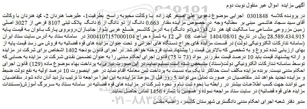 در پرونده کلاسه  0301848  اجرایی موضوع دعوی  علی اصغر محمد زاده  با وکالت محبوبه راسخ  بطرفیت1- علیرضا هنردان 2- محمد هنردان با وکالت آقای سید سجاد هاشمی  مبنی بر  مطالبه وجه  در خصوص مزایده مقدار 0.663 دانگ از دو دانگ از 6 دانگ  پلاک ثبتی 8107 فرعی از 3027 اصلی زمین مزروعی مشاعی با مالکیت محمد هنر دان قوژدی(دو دانگ) به آدرس کاشمر ضلع غربی بلوار جانبازان،روبروی پارک بانوان به قیمت پایه 28.589.434.915 ریال در تاریخ 1404/08/01  ساعت  08  الی 12 به شماره حراج 3004107157000104 در  سامانه ستاد به آدرس سایت ستاد ایران (سامانه تدارکات الکترونیکی دولت) در قسمت مزایده های حراج دستگاه های اجرائی و تحت عنوان مزایده های قوه قضائیه به فروش می رسد قیمت پایه از بهای ارزیابی شده شروع و به شخصی که بالاترین قیمت را پیشنهاد نماید فروخته خواهد شد. در اجرای قانون بودجه 1402 اشخاص برای شرکت در مزایده و ارائه پیشنهاد قیمت باید 10 درصد قیمت مقرر در مواد (73 تا 75) قانون اجرای احکام مدنی را به عنوان تضمین نقدی شرکت در مزایده به حسابی که توسط سامانه تدارکات الکترونیکی دولت(ستاد) مشخص شده است تسلیم نماید در این صورت نیازی به پرداخت بهاء موضوع ماده (129) قانون اجرای احکام مدنی نیست. برنده مزایده مکلف است حداکثر تا یک ماه نسبت به پرداخت ثمن معامله اقدام نماید در غیر اینصورت 10 درصد اولیه به نفع دولت ضبط و مزایده تجدید خواهد شد. متقاضیان در صورت تمایل می توانند 5 روز قبل از موعد مزایده به این اجرا مراجعه تا ترتیب بازدید آنان داده شود. متقاضیان می توانند جهت کسب اطلاعات بیشتر در رابطه با نحوه ثبت نام و نحوه شرکت در مزایده های قوه قضائیه در سامانه ستاد به سربرگ آموزش(مستندات مزایده های قوه قضائیه) در سایت ستاد مراجعه نموده و همچنین با شماره 1456 تماس حاصل نمایند.