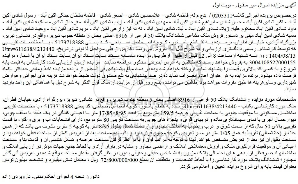 درخصوص پرونده اجرائی کلاسه0203311 / 4ج م له: فاطمه شادی - غلامحسین شادی - اصغر شادی - فاطمه سلطان جنگی اکین آباد - رسول شادی اکین آباد - اکبر شادی اکین آباد - حسن شادی - ابراهیم شادی اکین آباد - مهدی شادی اکین آباد - زینب شادی اکین آباد - فرحناز شادی - سکینه شادی اکین آباد - داود شادی اکین آباد محکوم علیه: ژیلا شادی اکین آباد - لیلا شادی امین آباد - نه نه قیز زارعی اکین آباد - مریم شادی اکین آباد - وحید شادی امین آباد - سمیه شادی امین آباد مبنی بر دستور فروش ملک مشاعی ششدانگ پلاک 50 فرعی از 8916-اصلی بخش 5 منطقه جنوب تبریز، واقع در نشانی: تبریز، بزرگراه آزادی، خیابان قطران، نرسیده به تقاطع پاستور، کوچه اسماعیل صباحی، کد پستی 5173718388 ، با مختصات تقریبی utm=611638/4213440 ،که توسط کارشناس رسمی دادگستری ارزیابی و به شرح ذیل به بفروش می رسد ،که پس از طی مـراحـل قا نونی درتاریخ 1404/08/13 روز سه شنبه ازساعت 8الی 12 قبل از ظهر ازطریق مزایده سامانه ستاد سایت ستاد ایران.سایت ستاد ایران با شماره مزایده 3004108527000155 به بفروش خواهد رسید که طالبین به آدرس اینترنتی مذکور مراجعه نمایند . مزایده ازمبلغ ارزیابی شده کارشناس به قیمت پایه شروع و به کسی که بالاترین قیمت را پیشنهاد نماید فروخته خواهد شد وده در صد مبلغ پیشنهادی فی المجلس از برنده مزایده اخذ ومابقی حداکثر یکماه فرصت داده میشود. برنده مزایده به هر عنوان اعلام انصراف نماید ده در صد پیشنهادی به نفع صندوق دولت ضبط خواهد شد هزینه های اجرائی وعوارض شهرداری وسایرهزینه ها طبق مقررات خواهد بود .طالبین می توانند، پنج روز قبل از مزایده از ملک فوق الذکر به شرح ذیل با هماهنگی این واحد بازدید نمایند.