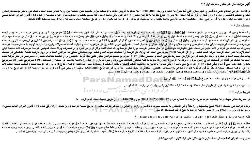 درکلاسه اجرایی احکام مدنی دادگستری شهرستان علی آباد کتول به شماره پرونده 0300480 ؛ که حکم به فروش ملک با اوصاف ذیل و تقسیم ثمن معامله بین ورثه صادر شده است ، ملک مورد نظر توسط کارشناس محترم منتخب دادگستری مورد ارزش گذاری قرار گرفته است ، که پس از ابلاغ نظریه به طرفین مصون از اعتراض باقی مانده است ، لذا حسب تقاضای محکوم لها و اجازه حاصله از ماده 114 قانون اجرای احکام مدنی و با رعایت شرایط مزایده به فروش می رسد . متقاضیان خرید مال می توانند جهت ارائه پیشنهاد خرید در روز و ساعت تعیین شده از طریق سامانه ستاد نسبت به ارائه و ثبت پیشنهاد اقدام نمایند .