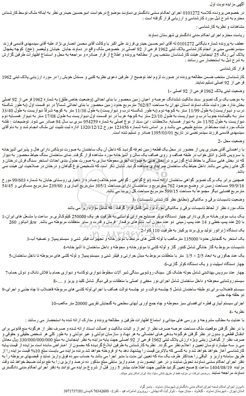 در خصوص پرونده کلاسه 0101272 اجرای احکام مدنی دادگستری دماوند موضوع درخواست امیرحسین حیدری نظر به اینکه ملک توسط کارشناس محترم به شرح ذیل مورد کارشناسی و ارزیابی قرار گرفته است :